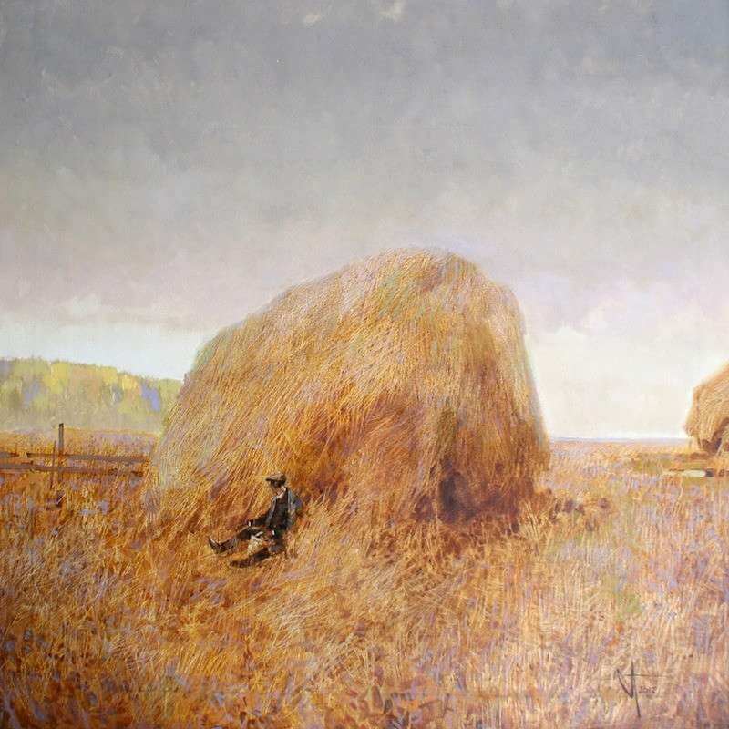 Under the grey veil of drizzle, a tired mushroom picker is resting. It is amazing how laconically and accurately Alexander Savin manages to capture the mood. Even time seems to have stood still. Together with the traveller, we can enjoy the silence and tranquillity of nature.