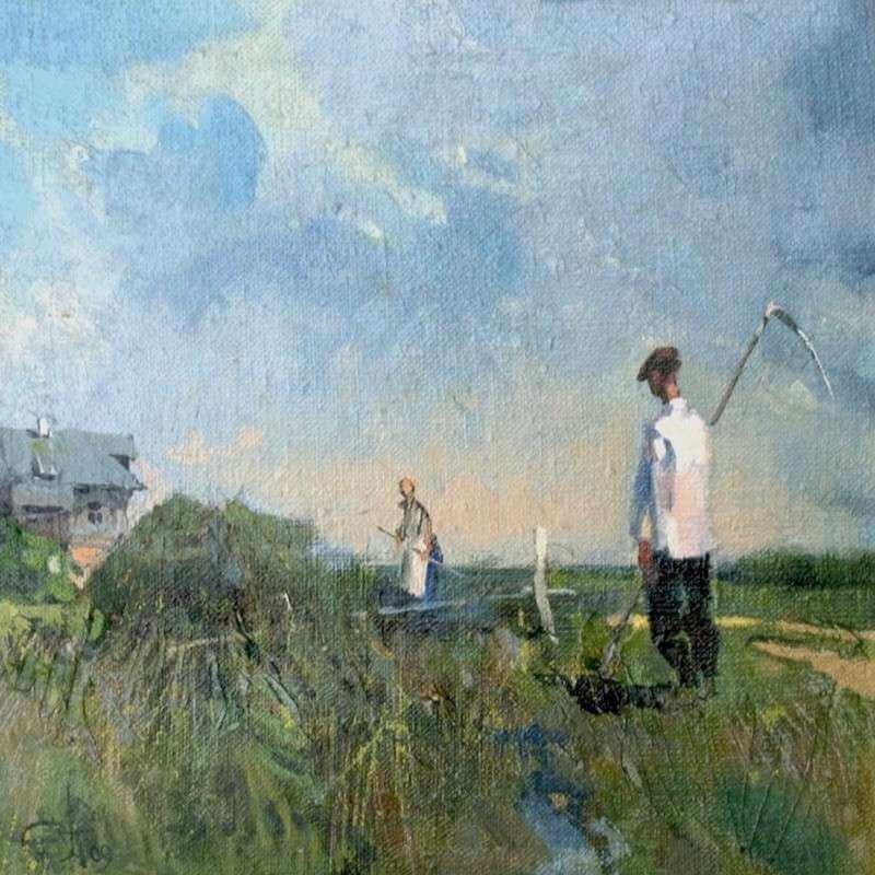 See how simple and clear village life, and haymaking on a hot summer day, was captured by Alexander Savin. The small size of the painting, 25×25 cm, makes it very charming.